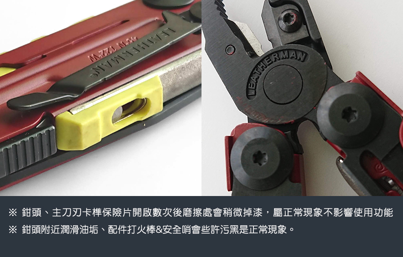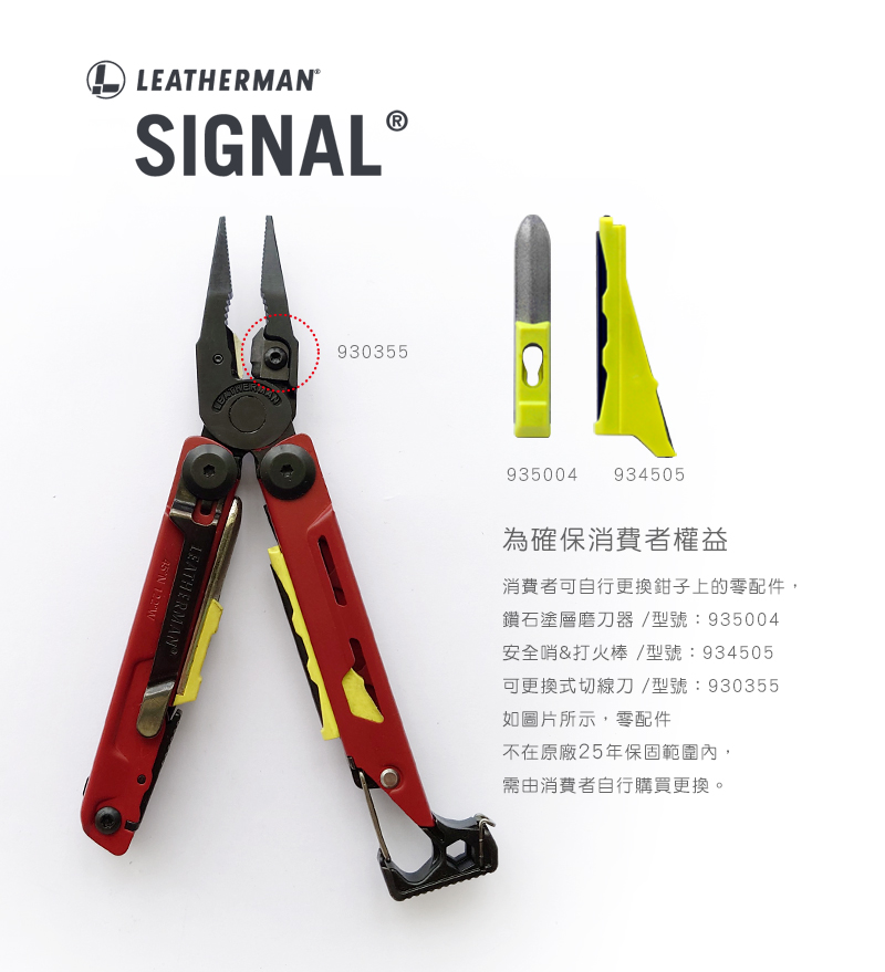 安全哨&打火棒、鑽石塗層磨刀器、可更換式切線刀屬於可更換式零件,原廠不列入保固範圍,若發生損壞及遺失需另購買。