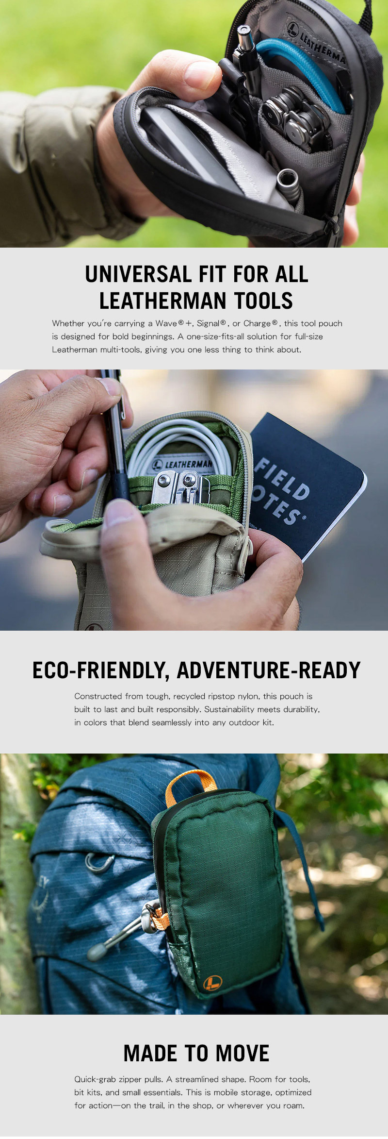 Leatherman 工具袋幫助您輕鬆攜帶-包含許多配色。它採用防撕裂尼龍布料製成,可容納所有全尺寸 Leatherman 工具。