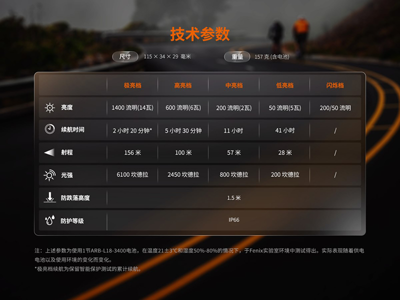 注:上述參數為使用1節ARB-L18-3400電池,在溫度21±3℃和濕度50%-80%的情況下,於Fenix實驗室環境中測試得出。實際表現隨著供電電池以及使用環境的變化而變化。