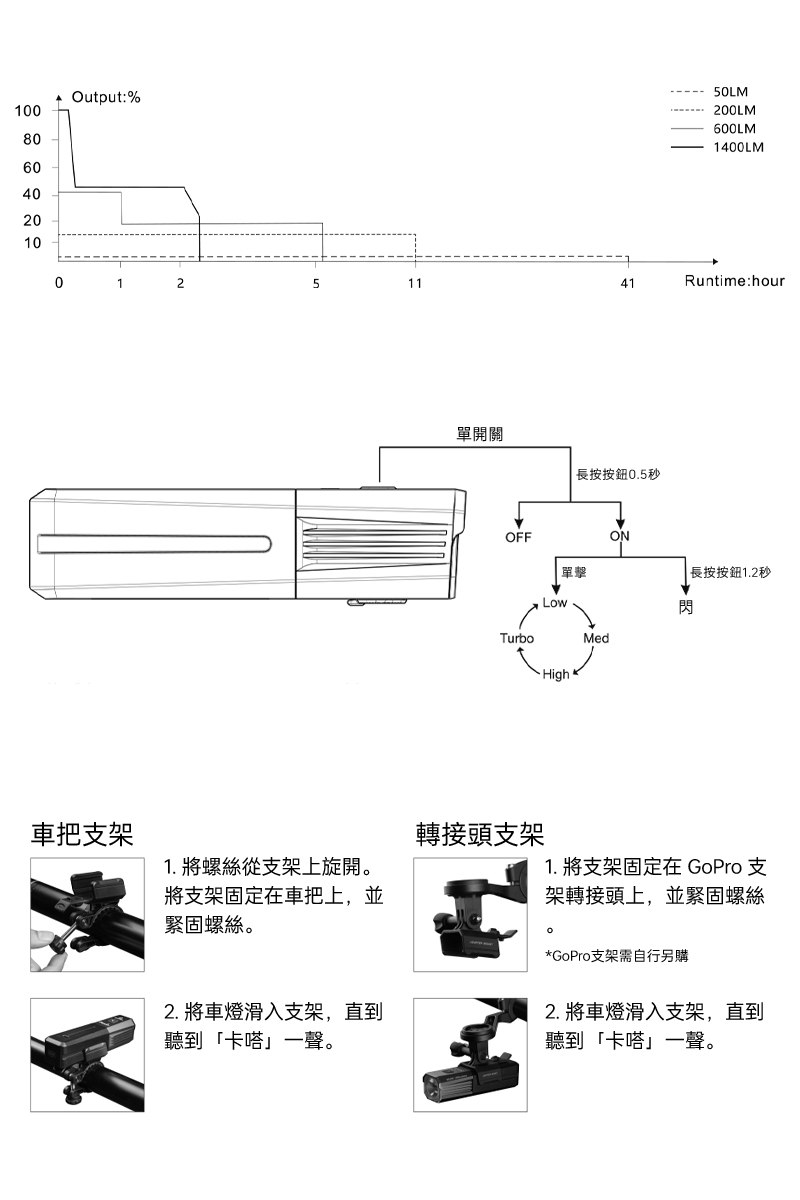 車燈會自動記憶照明檔位(不含閃爍檔),每次開機時,都會以關機前的檔位開始工作。電池選用