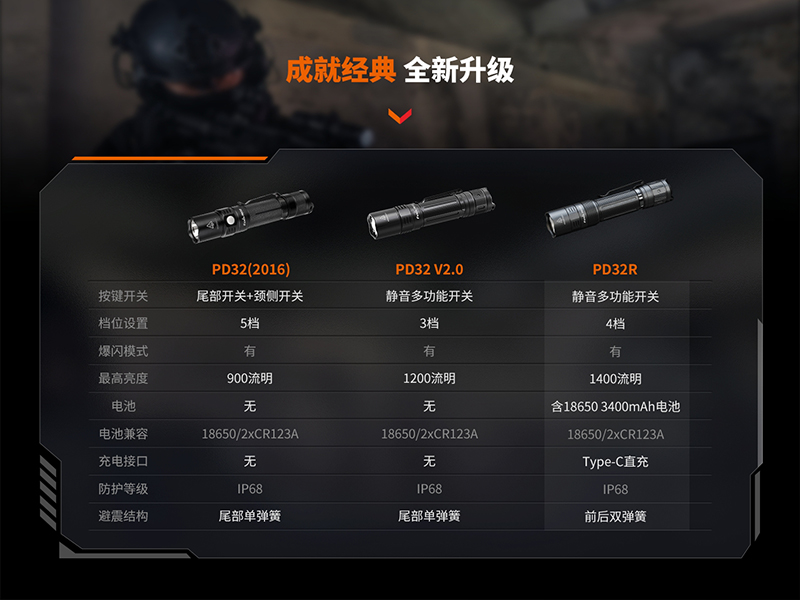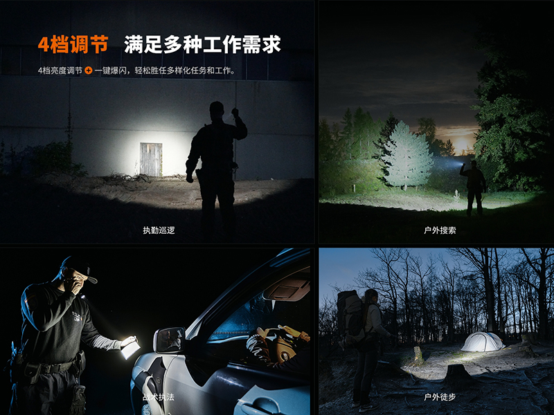 答:推薦使用FenixARB-L18-3400鋰離子電池,同時相容2節3V CR123A鋰電池。使用CR123A電池時,手電極亮檔最高亮度可達到800流明,最遠射程為270米,使用低亮檔的最長續航約為30小時。不建議使用其他鋰離子電池,高亮度檔位對電池的電流電壓有一定要求,性能不匹配的電池可能會導致手電筒無法正常使用。十、PD32R有哪些可以搭配的配件?