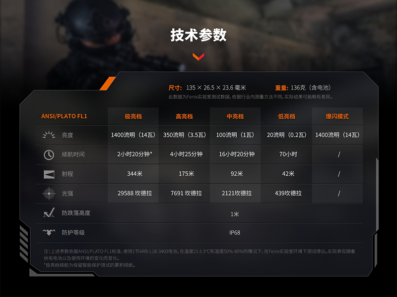 注:上述參數依據ANSI/PLATO FL1標準,使用1節ARB-L18-3400電池,在溫度21±3℃和濕度50%-80%的情況下,在Fenix實驗室環境下測試得出。實際表現隨著供電電池以及使用環境的變化而變化。