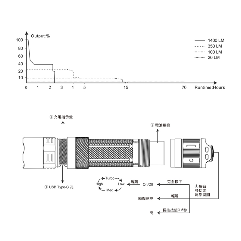 6.使用極亮檔時,手電筒外殼會產生高熱,所以除非工作勤務必要,不建議消費者,長時間使用極亮檔模式。如因手電筒外殼溫度較高,而感到不適,請自行手動,依任務或環境需求,適時切換為高亮檔或中亮檔,以達使用舒適度。(但每個人對溫度的感覺不盡相同,因人而異)。