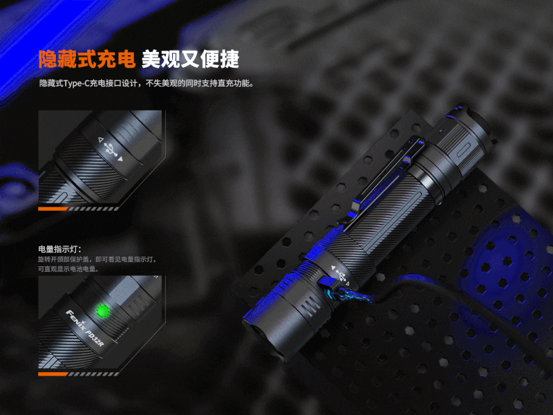 3.隱藏式Type-C充電介面,兼具美觀的同時防塵又防水。二、PD32R使用LED是什麼型號?Fenix是否能幫我更換LED?