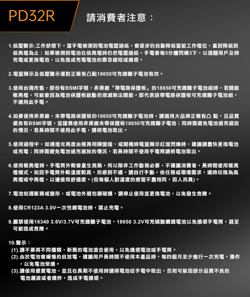 9.嚴禁使用16340 3.6V/3.7V可充鋰離子電池、18650 3.2V可充磷酸鐵鋰電池以免損壞手電筒,甚至可能造成危險。