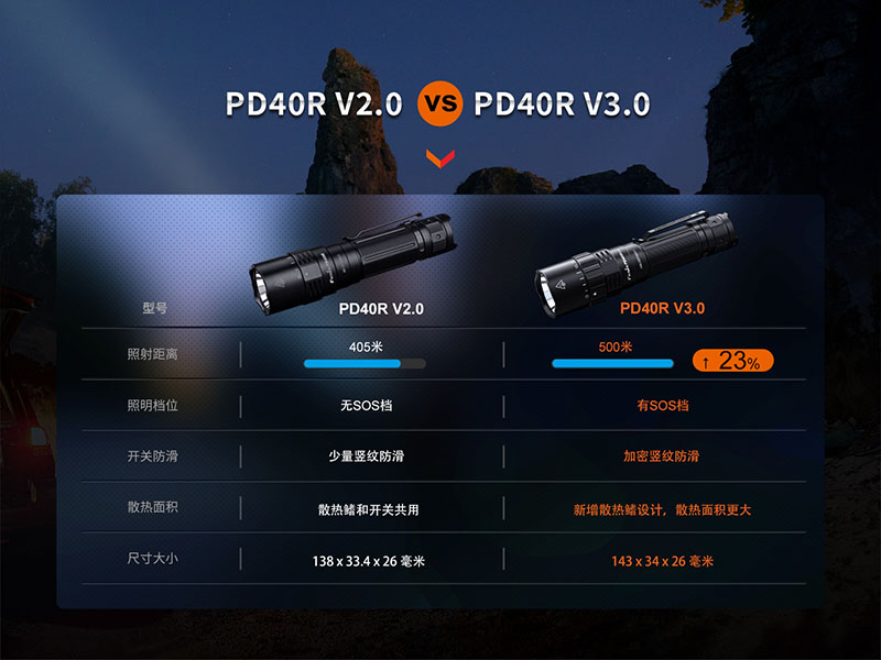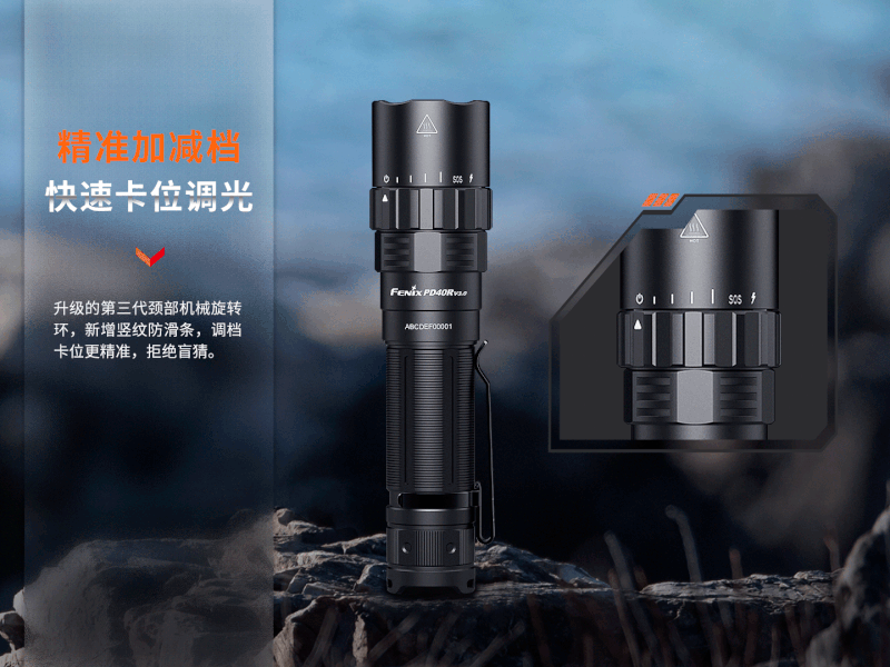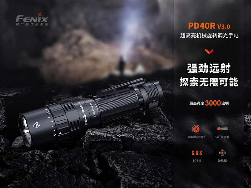 答:Fenix PD40R V3.0是一款超高亮機械旋轉調光手電筒,它的主要亮點在於: