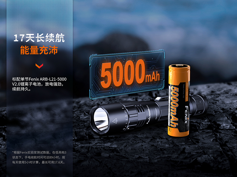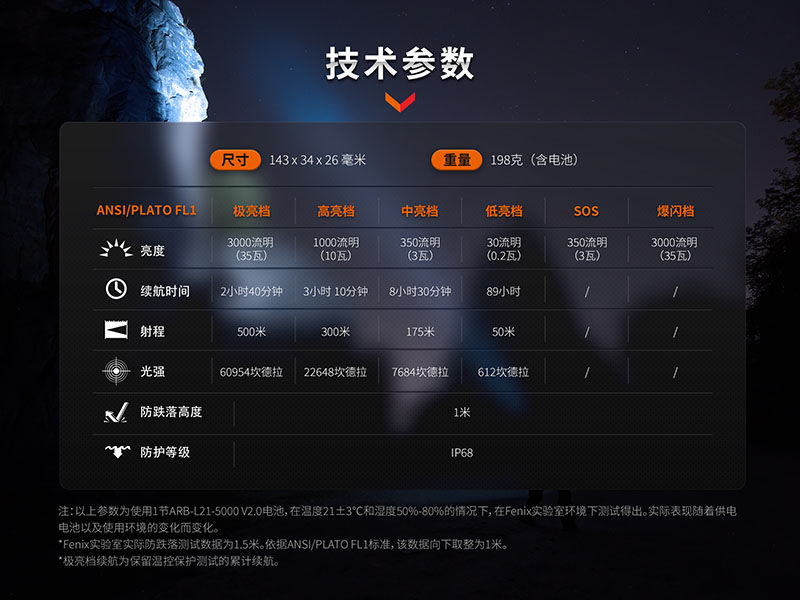 注:以上參數為使用1節ARB-L21-5000 V2.0電池,在溫度21±3℃和濕度50%-80%的情況下,在Fenix實驗室環境下測試得出。實際表現隨著供電電池以及使用環境的變化而變化。